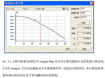 UV1101為1nm 帶寬,是上海天美科學儀器有限公司主要為醫藥類企業研發設計的經濟機型。具有動力學監測,光譜掃描,光度(dù)量等功能,其中動力學(xué)掃(sǎo)描間隔為0.1~100 秒,掃描時(shí)間可長達(dá)24h;另外(wài),選配的UV Analyst PC軟件還可(kě)計(jì)算自動(dòng)酶活性值及光度(dù)變化的線性回歸係數(shù)計算,極(jí)其(qí)方便,非常適用蛋白酶類樣品的分析檢測。按照現行藥典方法,采用UV1101分光光度計(jì)對糜蛋白酶催化(huà)反應中吸(xī)光度變(biàn)化進行監測及活性值測定,測定結果(guǒ)示例如下: